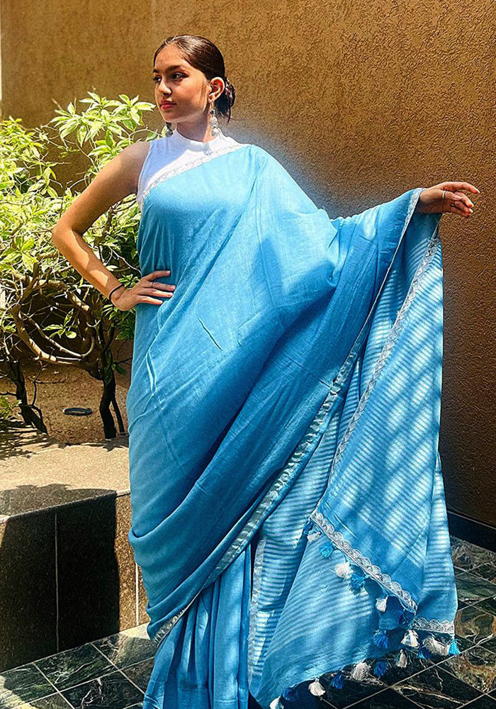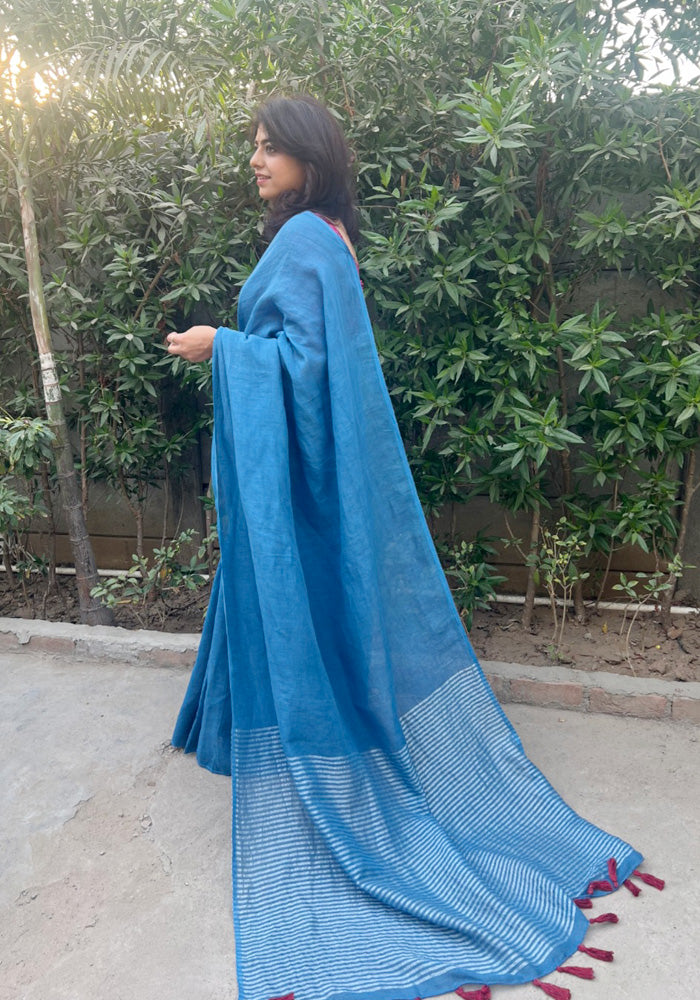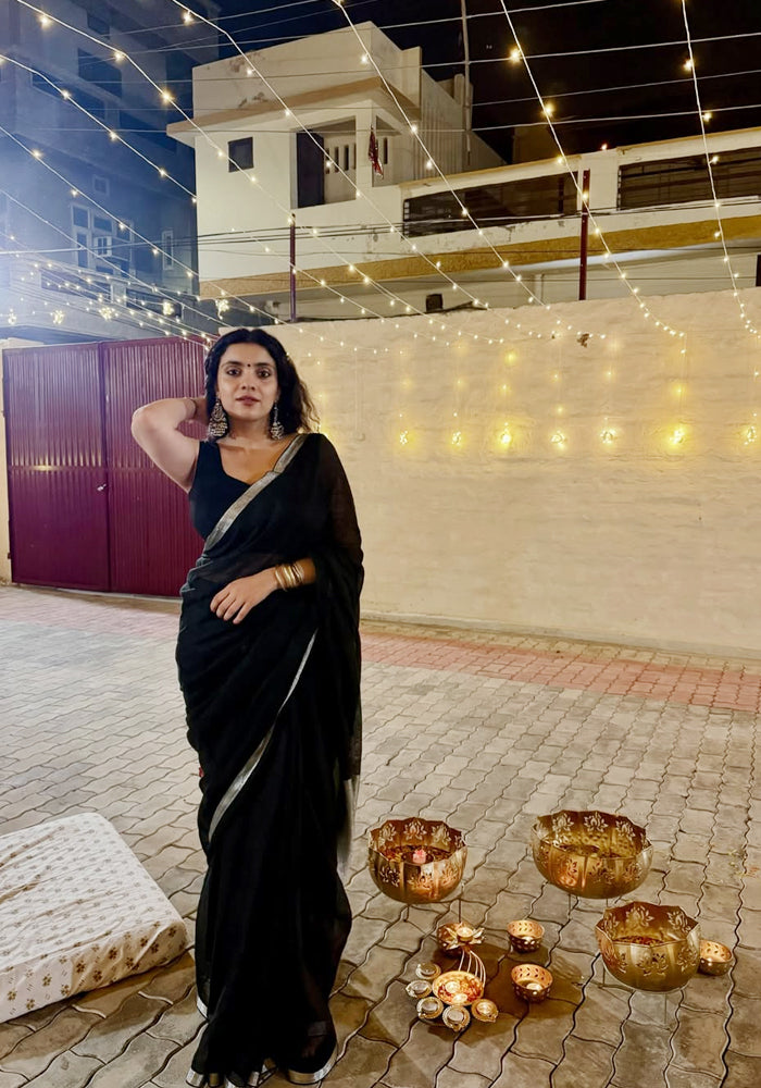 Crafted from breathable linen fabric and adorned with intricate silver threads, these sarees...