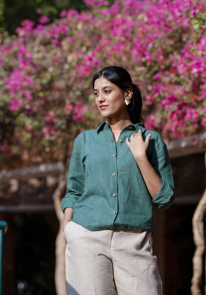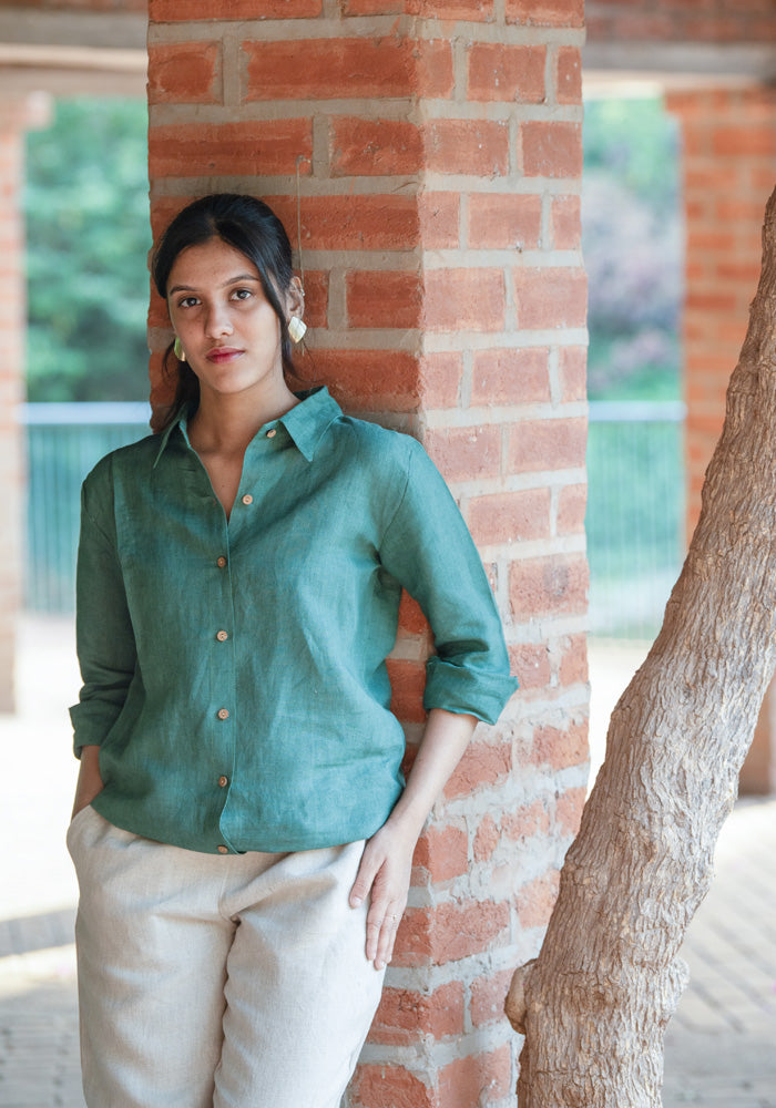 A treat for the color-loving soul. In a rich emerald hue, this shirt brings a vibrant pop to any wardrobe. Easy to dress up or down, it pairs effortlessly with denims, trousers, layers, and more—made to complement different outfits and occasions with everyday ease.