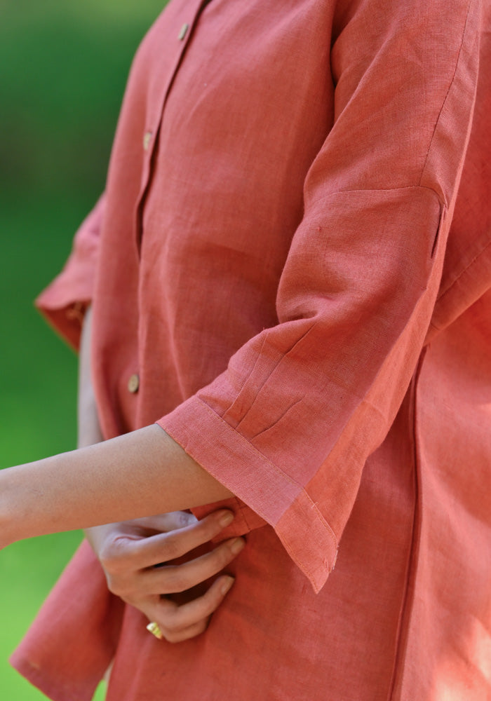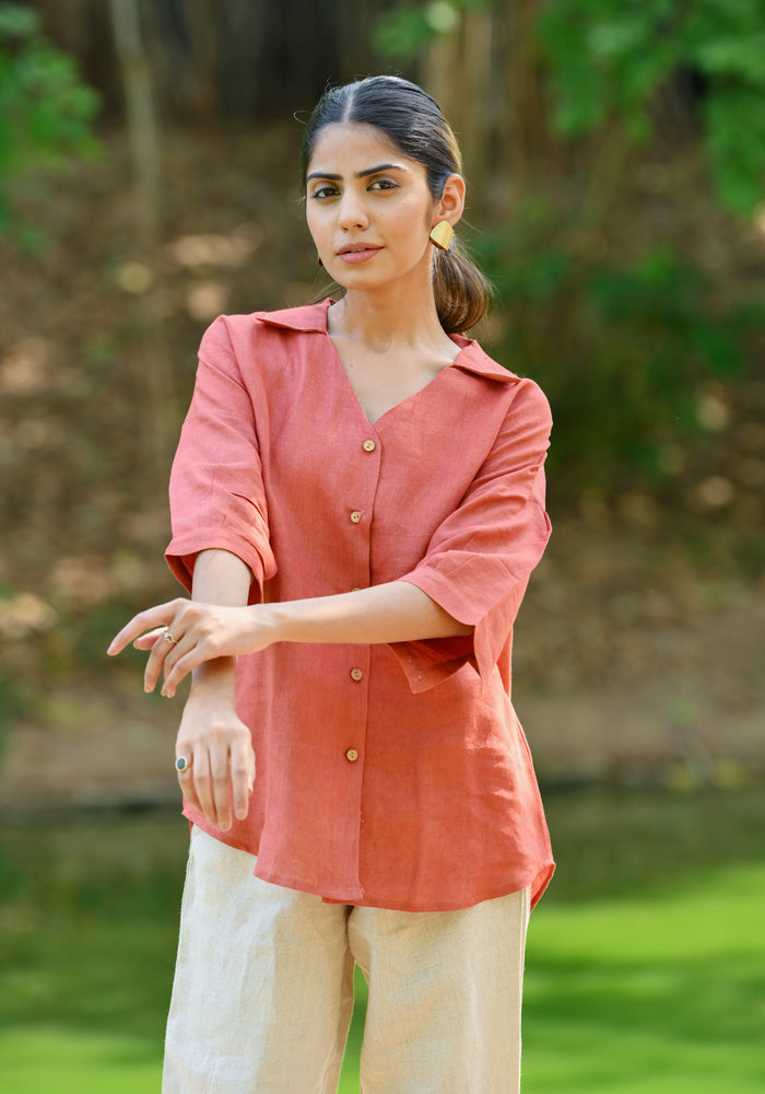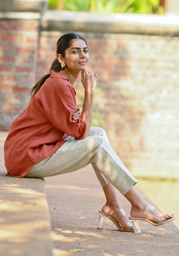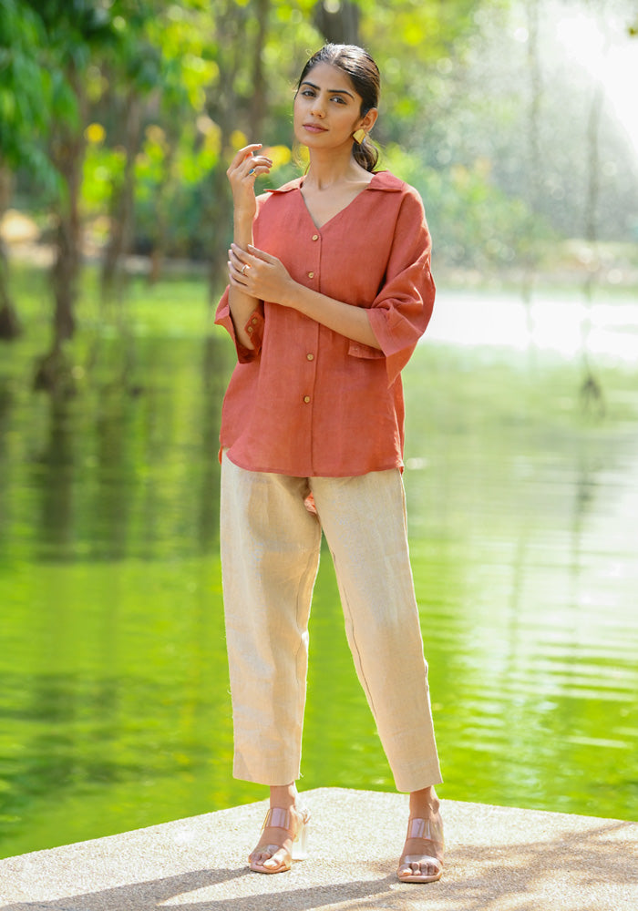 An easygoing rhythm in rust. Designed with drop shoulders, airy sleeves, and a relaxed fit that feels just right for slow, sunlit days. Effortless, breathable, and made to mirror your calm this piece is all about laid-back charm and easy movement. Can be paired with trousers, denims, shorts and styles in multiple ways.