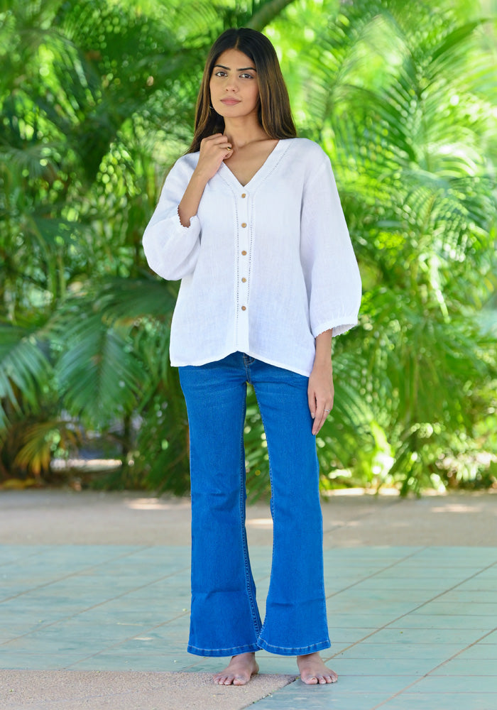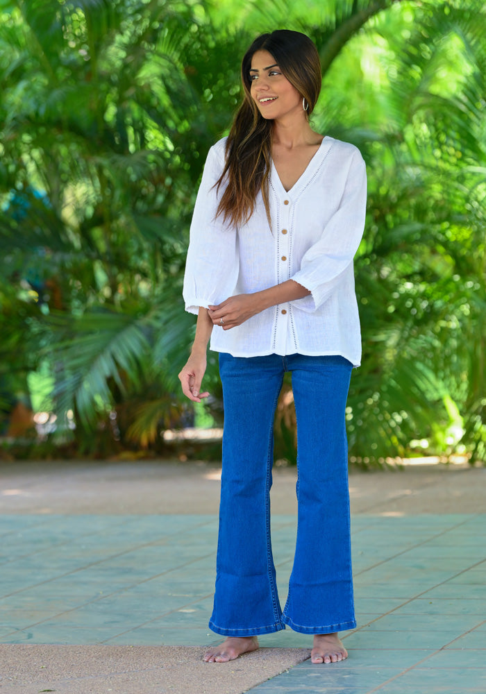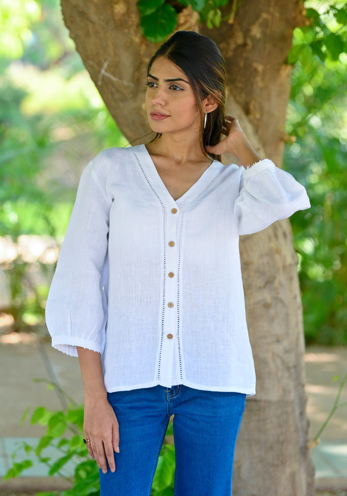 A soft play of white and lace subtle, airy, and quietly striking. Crafted with delicate inseam lace details, this shirt brings a touch of grace to everyday dressing while staying effortlessly wearable.